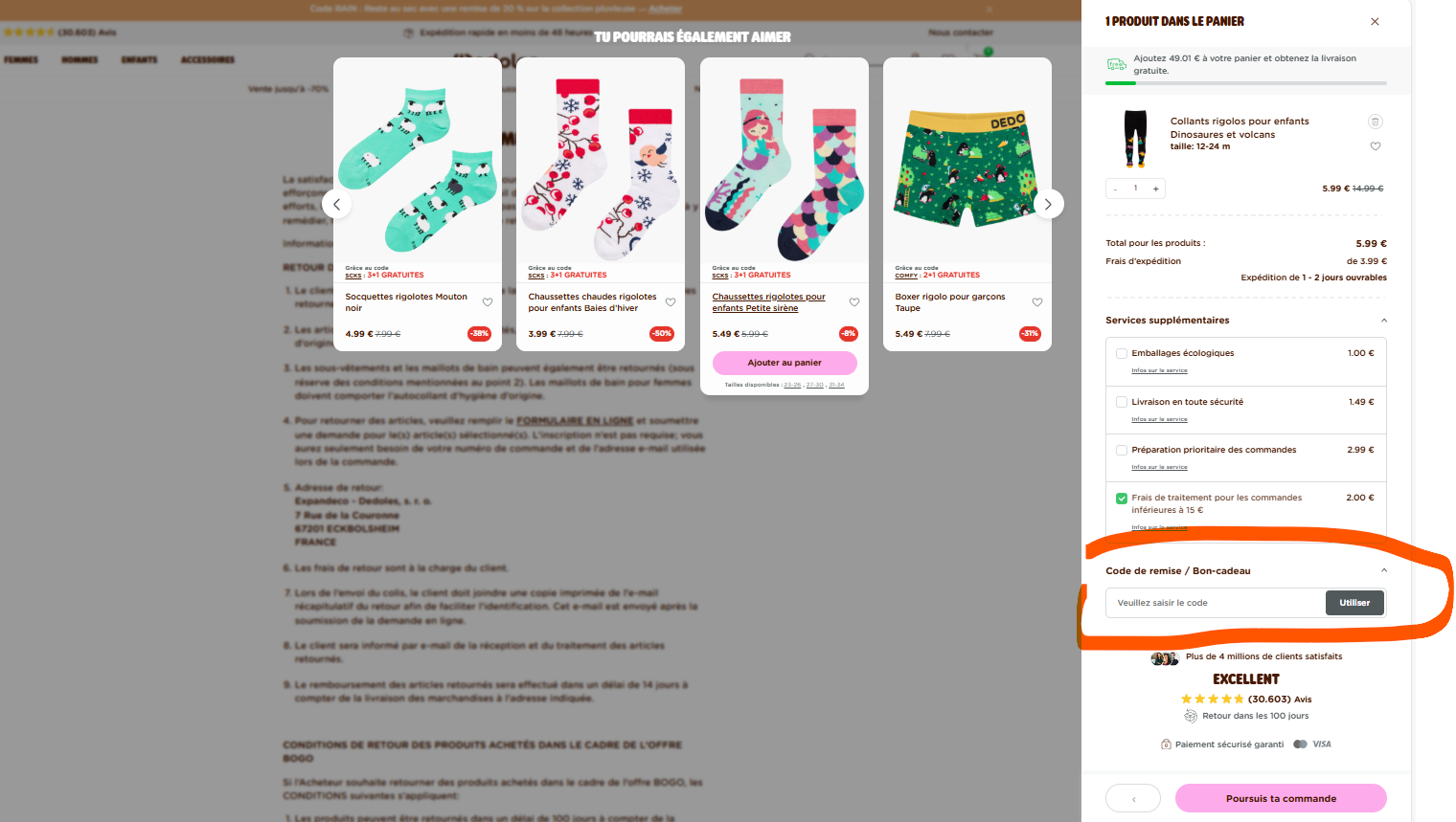 Le code doit être appliqué lors de la première étape du processus de commande. Entrez simplement le code dans la case appropriée dans le panier avec la mention «Code de remise / Bon-cadeau» et confirmez-le en cliquant sur le bouton «Utiliser». Il est nécessaire de saisir ce code dans le même format que celui que vous avez reçu - en majuscules et sans espaces.